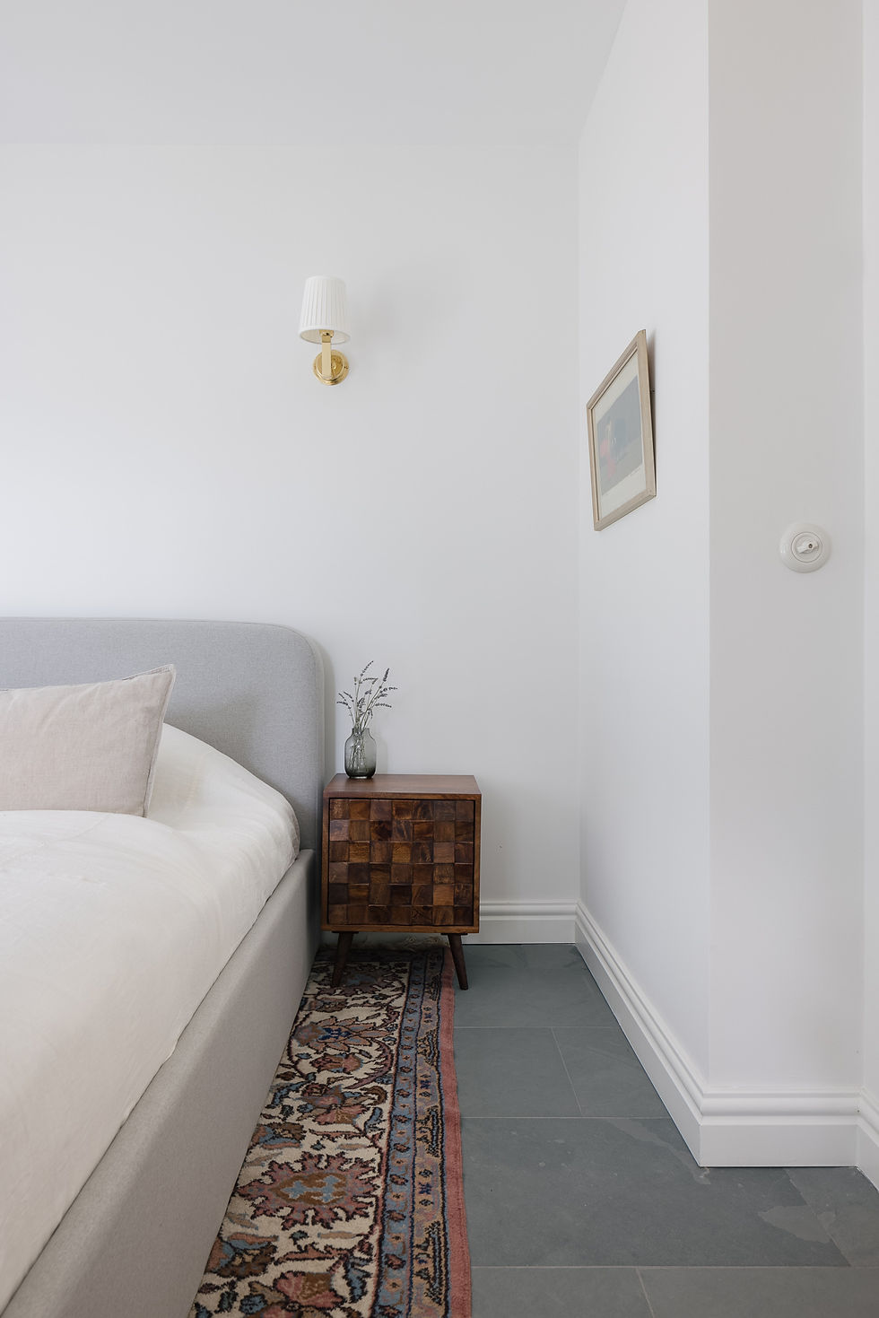 Auch das Mobiliar, die Accessoires und die Leuchten folgen dem puristischen Konzept, während sie gleichzeitig spannungsreiche Formen und hochwertige Materialien wie Messing, Rattan und Schiefer präsentieren. Das kleine Badezimmer harmoniert optisch mit dem Marmor-Konglomerat der Küchenarbeitsplatte. Kombiniert mit italienischen Bodenfliesen in drei Farbtönen und modernen schwarzen Armaturen wird die klassische Ästhetik des Marmors behutsam aufgebrochen.